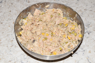 3. Scoop out all three cans of tuna into a medium sized bowl and break up the tuna chunks with a fork.